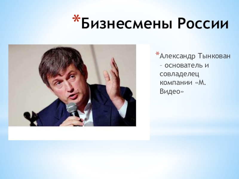 Бизнесмены РоссииРустам Тарико – создатель первого банка «Русский стандарт», ориентированного на выдачу кредита.