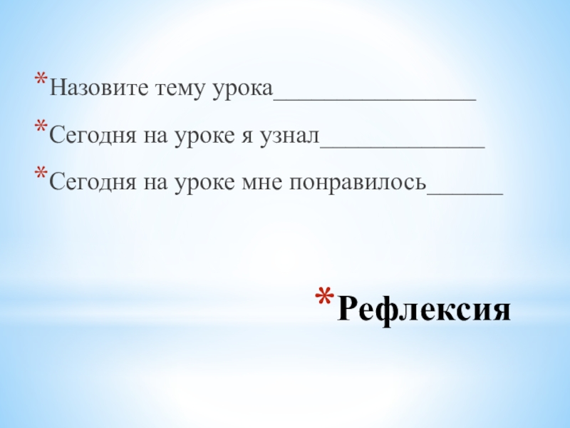 РефлексияНазовите тему урока________________Сегодня на уроке я узнал_____________Сегодня на уроке мне понравилось______