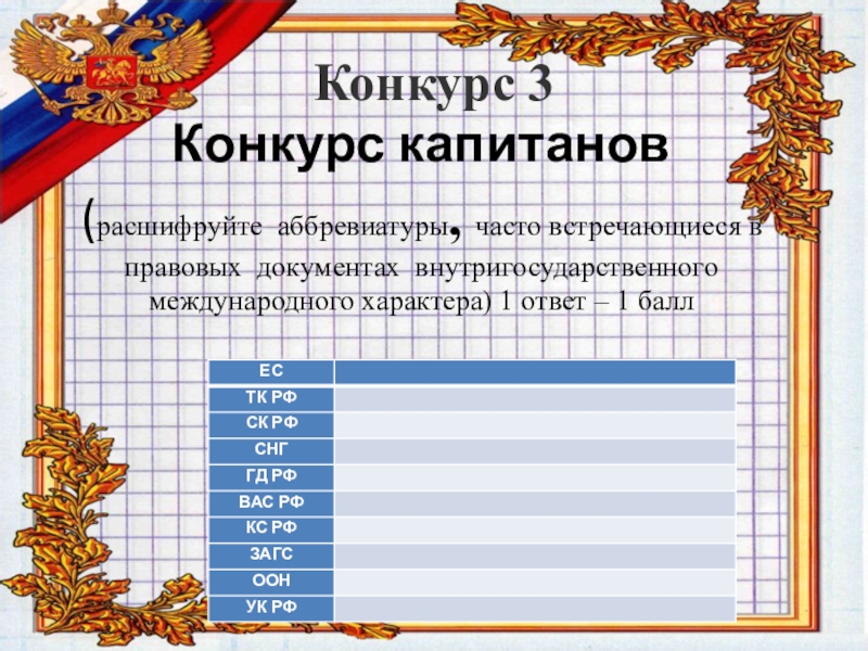 ним вам необходимо классифицировать правонарушения, определить вид и меру ответственности за каждое из них. Устный ответ дает капитан команды. Максимальное количество баллов – 5 . Время – 1 минута)