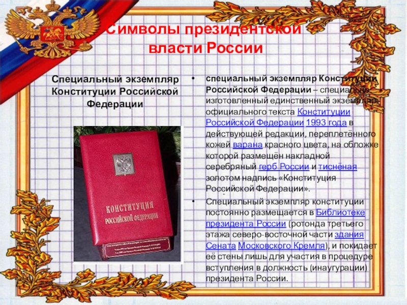 единственный экземпляр официального текста Конституции Российской Федерации 1993 года в действующей редакции, переплетённого кожей варана красного цвета, на обложке которой размещён накладной серебряный герб России и тиснёная золотом надпись «Конституция Российской Федерации».