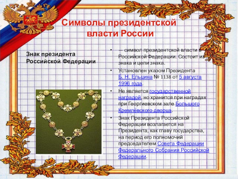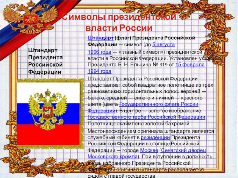1996 года — «главный символ») президентской власти в Российской Федерации. Установлен указом Президента Б. Н. Ельцина № 319 от 15 февраля 1994 года