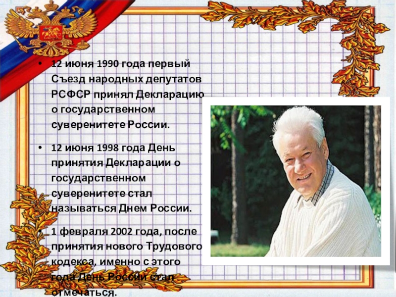 Слайд 512 июня 1990 года первый Съезд народных депутатов РСФСР принял Декларацию