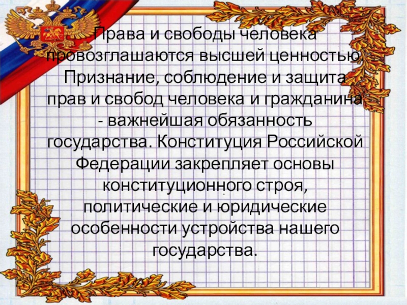 прав и свобод человека и гражданина - важнейшая обязанность государства. Конституция Российской Федерации закрепляет основы конституционного строя, политические и юридические особенности устройства нашего государства.