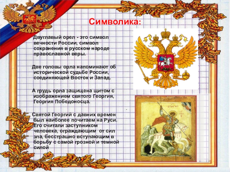 Две головы орла напоминают об исторической судьбе России, соединяющей Восток и Запад.