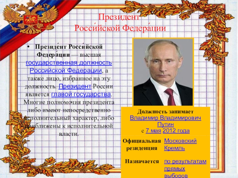 а также лицо, избранное на эту должность. Президент России является главой государства. Многие полномочия президента либо имеют непосредственно исполнительный характер, либо приближены к исполнительной власти.