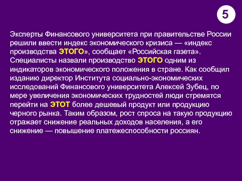 — «индекс производства ЭТОГО», сообщает «Российская газета». Специалисты назвали производство ЭТОГО одним из индикаторов экономического положения в стране. Как сообщил изданию директор Института социально-экономических исследований Финансового университета Алексей Зубец, по мере увеличения экономических трудностей люди стремятся перейти на ЭТОТ более дешевый продукт или продукцию черного рынка. Таким образом, рост спроса на такую продукцию отражает снижение реальных доходов населения, а его снижение — повышение платежеспособности россиян.