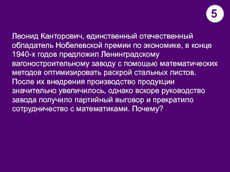 1940-х годов предложил Ленинградскому вагоностроительному заводу с помощью математических методов оптимизировать раскрой стальных листов. После их внедрения производство продукции значительно увеличилось, однако вскоре руководство завода получило партийный выговор и прекратило сотрудничество с математиками. Почему?