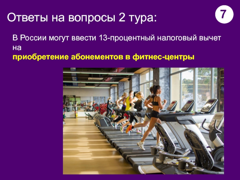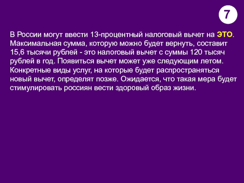 которую можно будет вернуть, составит 15,6 тысячи рублей - это налоговый вычет с суммы 120 тысяч рублей в год. Появиться вычет может уже следующим летом. Конкретные виды услуг, на которые будет распространяться новый вычет, определят позже. Ожидается, что такая мера будет стимулировать россиян вести здоровый образ жизни.