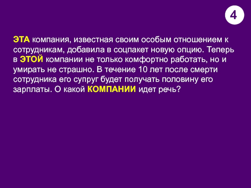 новую опцию. Теперь в ЭТОЙ компании не только комфортно работать, но и умирать не страшно. В течение 10 лет после смерти сотрудника его супруг будет получать половину его зарплаты. О какой КОМПАНИИ идет речь?