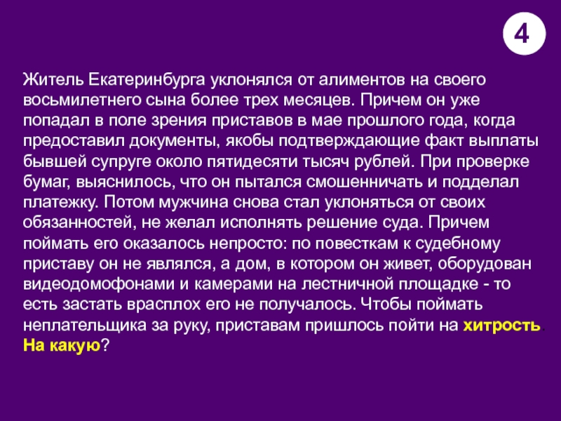 Слайд 30Житель Екатеринбурга уклонялся от алиментов на своего восьмилетнего сына более трех