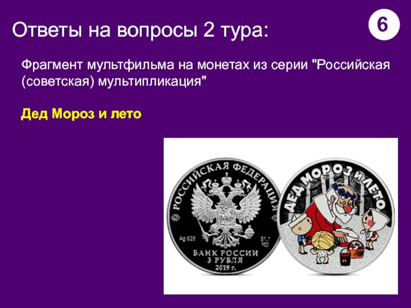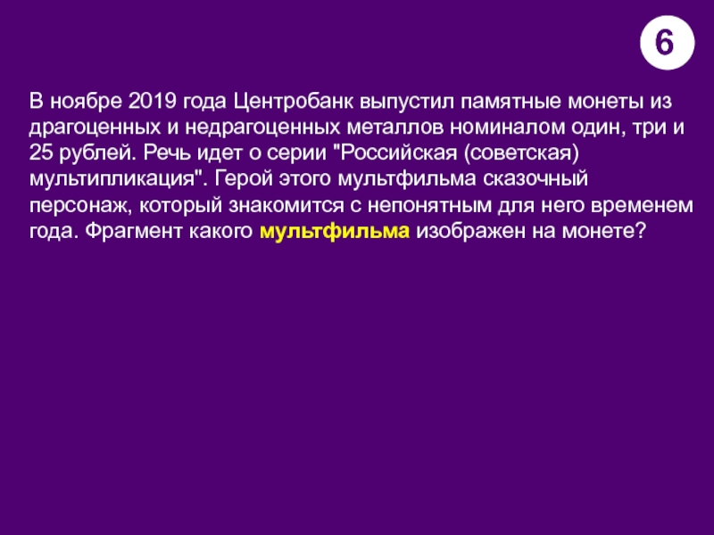 недрагоценных металлов номиналом один, три и 25 рублей. Речь идет о серии "Российская (советская) мультипликация". Герой этого мультфильма сказочный персонаж, который знакомится с непонятным для него временем года. Фрагмент какого мультфильма изображен на монете?