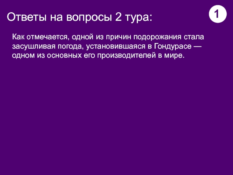 Как отмечается, одной из причин подорожания стала засушливая погода, установившаяся в Гондурасе — одном из основных его производителей в мире.