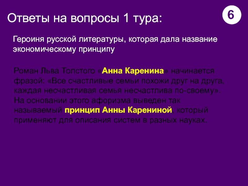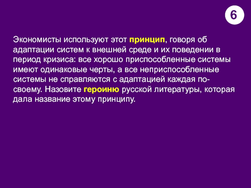и их поведении в период кризиса: все хорошо приспособленные системы имеют одинаковые черты, а все неприспособленные системы не справляются с адаптацией каждая по-своему. Назовите героиню русской литературы, которая дала название этому принципу.