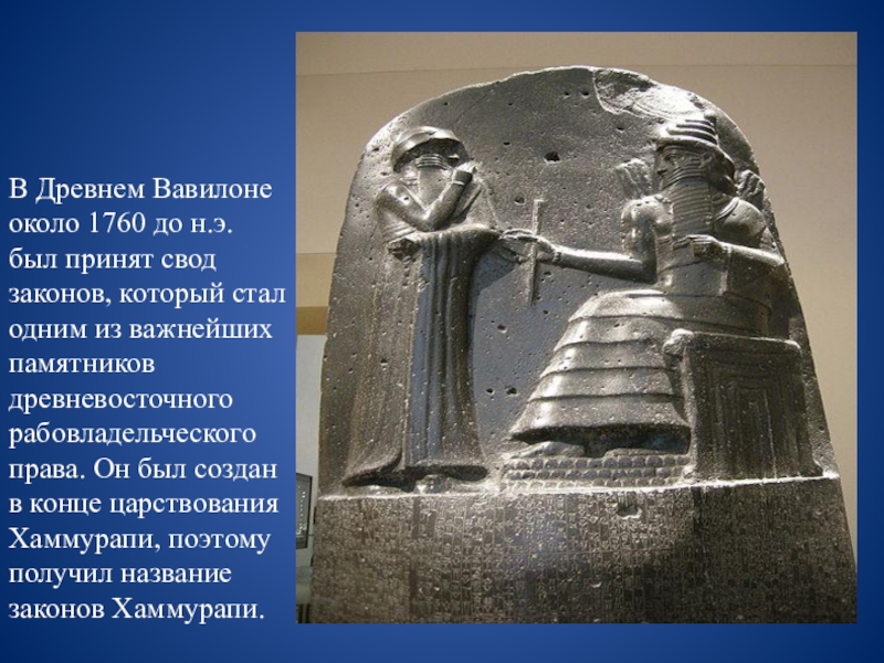 Слайд 8В Древнем Вавилоне около 1760 до н.э. был принят свод законов,