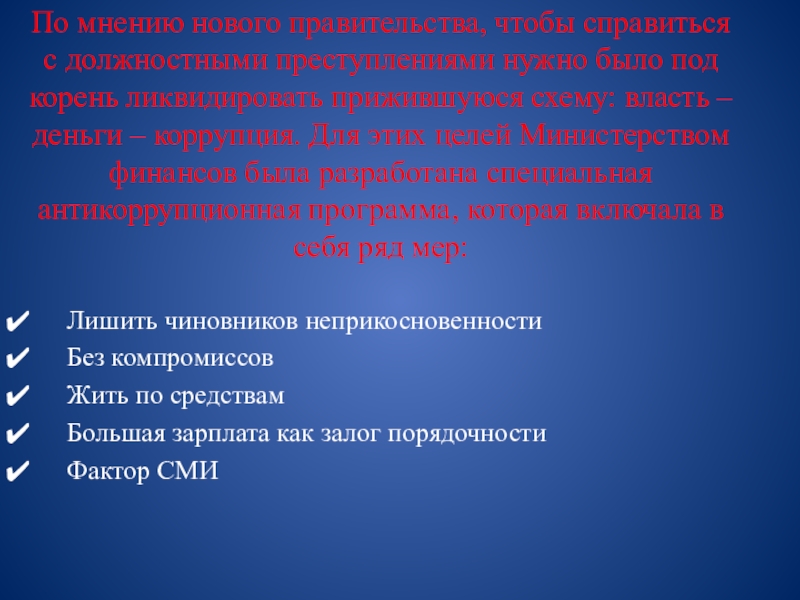 Слайд 10По мнению нового правительства, чтобы справиться с должностными преступлениями нужно было