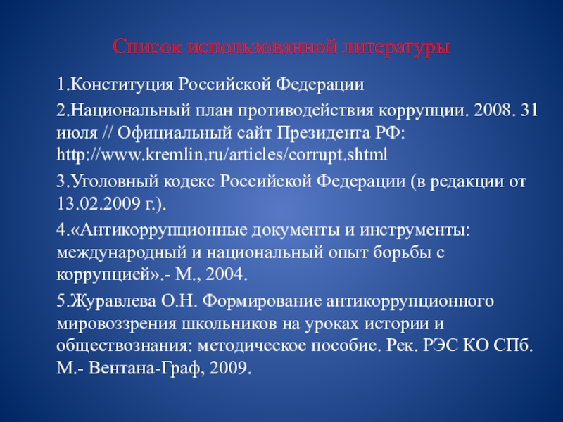 5.Журавлева О.Н. Формирование антикоррупционного мировоззрения школьников на уроках истории и обществознания: методическое пособие. Рек. РЭС КО СПб. М.- Вентана-Граф, 2009.