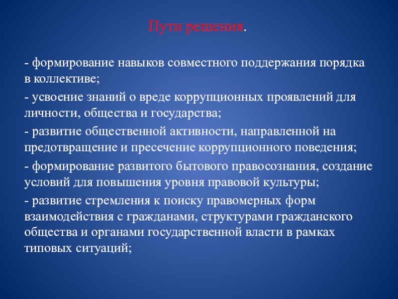 - развитие чувства нравственной ответственности за совершение коррупционных действий, наносящих ущерб