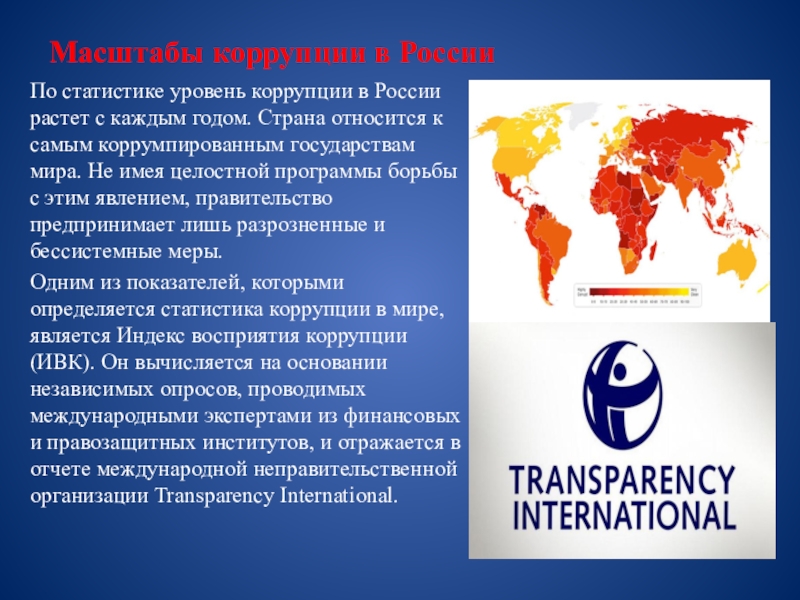 Одним из показателей, которыми определяется статистика коррупции в мире, является Индекс восприятия коррупции (ИВК). Он вычисляется на основании независимых опросов, проводимых международными экспертами из финансовых и правозащитных институтов, и отражается в отчете международной неправительственной организации Transparency International.