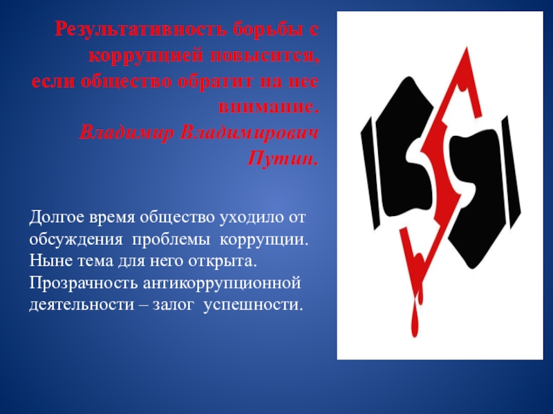 Долгое время общество уходило от обсуждения проблемы коррупции. Ныне тема для него открыта. Прозрачность антикоррупционной деятельности – залог успешности.
