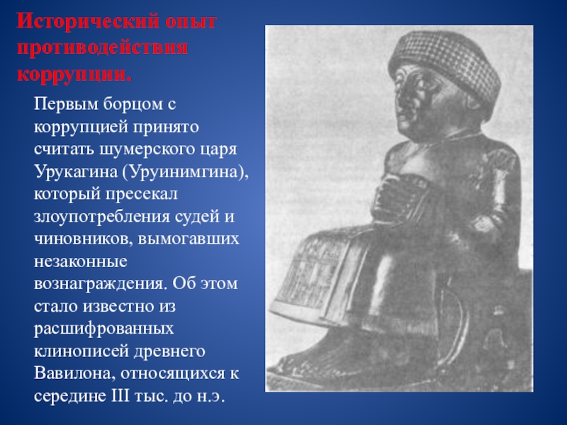Урукагина (Уруинимгина), который пресекал злоупотребления судей и чиновников, вымогавших незаконные вознаграждения. Об этом стало известно из расшифрованных клинописей древнего Вавилона, относящихся к середине III тыс. до н.э.