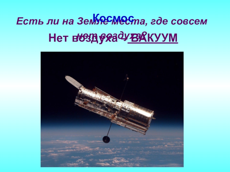 Есть ли на Земле места, где совсем нет воздуха?КосмосНет воздуха – ВАКУУМ
