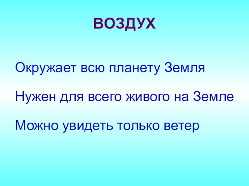 ВОЗДУХОкружает всю планету ЗемляНужен для всего живого на ЗемлеМожно увидеть только ветер