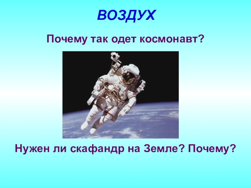 ВОЗДУХПочему так одет космонавт? Нужен ли скафандр на Земле? Почему?