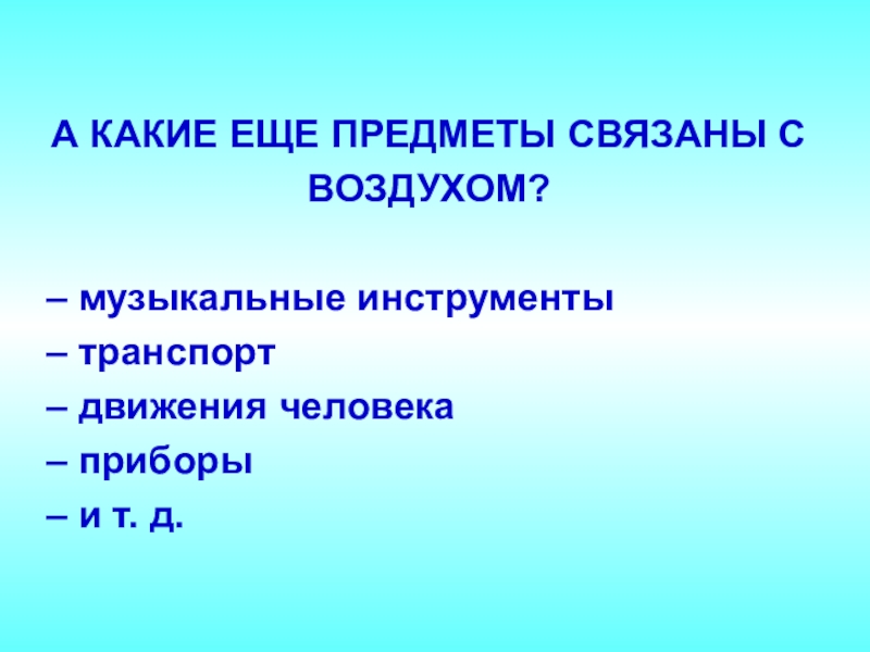 А КАКИЕ ЕЩЕ ПРЕДМЕТЫ СВЯЗАНЫ С ВОЗДУХОМ?– музыкальные инструменты– транспорт– движения человека– приборы– и т. д.