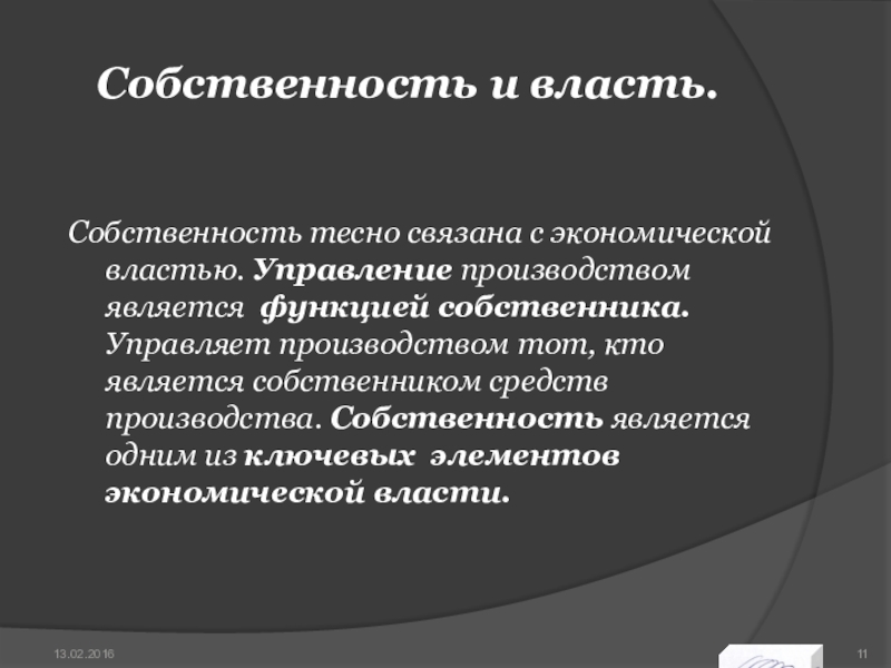 функцией собственника. Управляет производством тот, кто является собственником средств производства. Собственность является одним из ключевых элементов экономической власти.