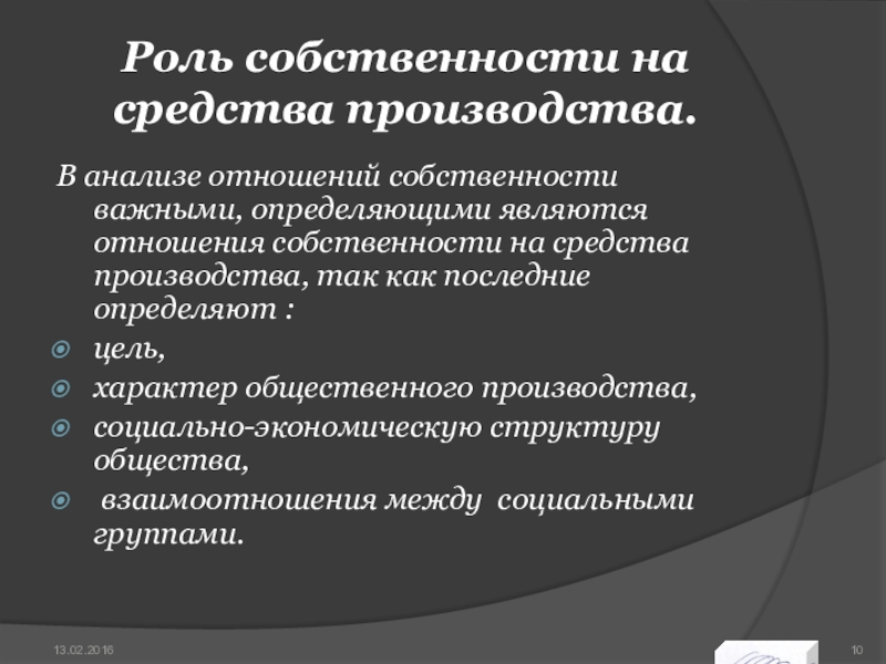 а также глубинной основы собственности как отношения между людьми. Анализ собственности как экономического отношения, требует изучения отношений между людьми, которые складываются по поводу владения средствами производства и результатов их использования. Определяющим в характеристике отношений собственности являются отношения присвоения, которые являются следствием владения и распоряжения объектов собственности.