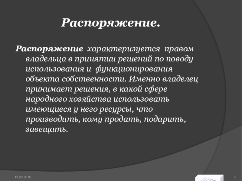 Распоряжение характеризуется правом владельца в принятии решений по поводу использования и