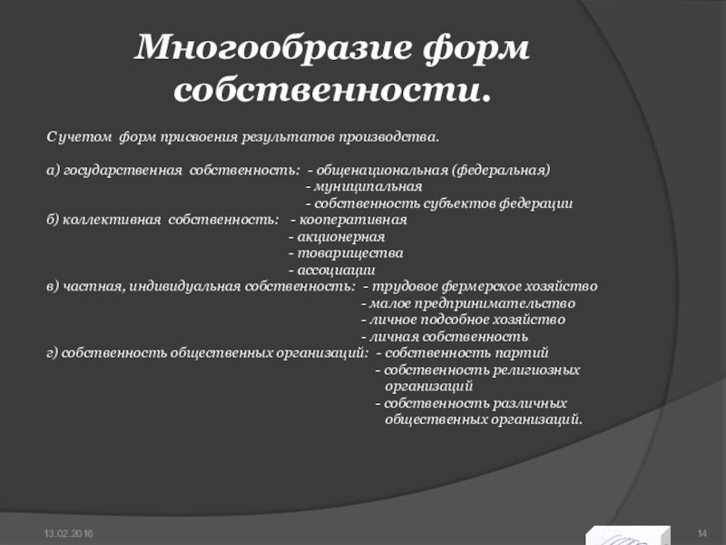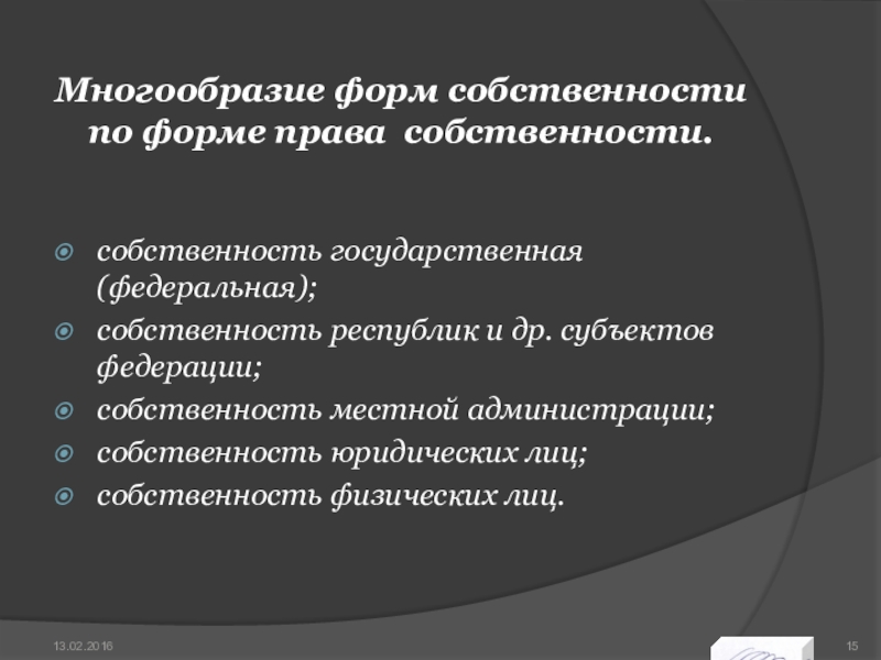 Слайд 15Многообразие форм собственности по форме права собственности.