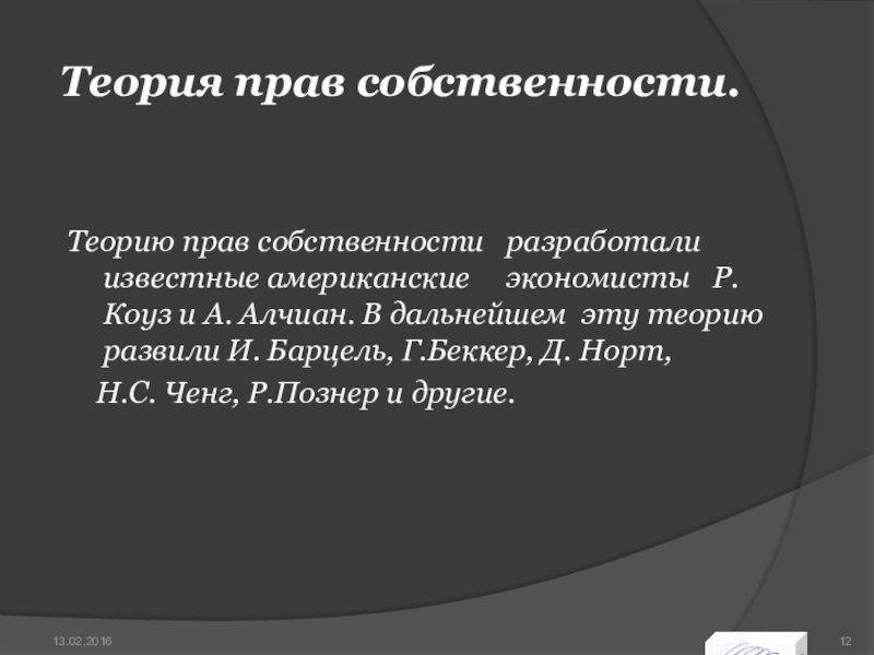 экономисты Р. Коуз и А. Алчиан. В дальнейшем эту теорию развили И. Барцель, Г.Беккер, Д. Норт,