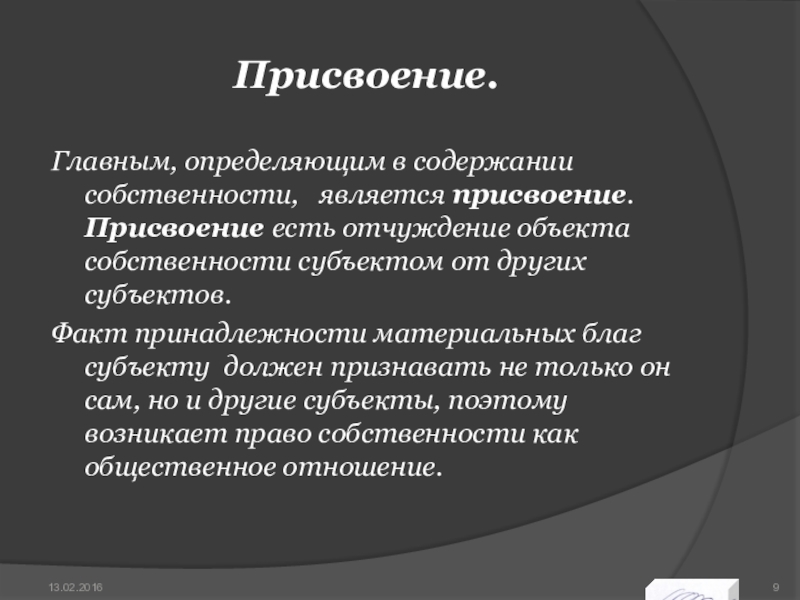 Главным, определяющим в содержании собственности, является присвоение. Присвоение есть отчуждение