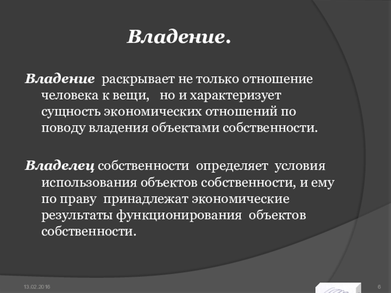 характеризует сущность экономических отношений по поводу владения объектами собственности.
