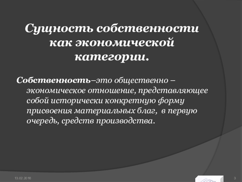 Собственность–это общественно – экономическое отношение, представляющее собой