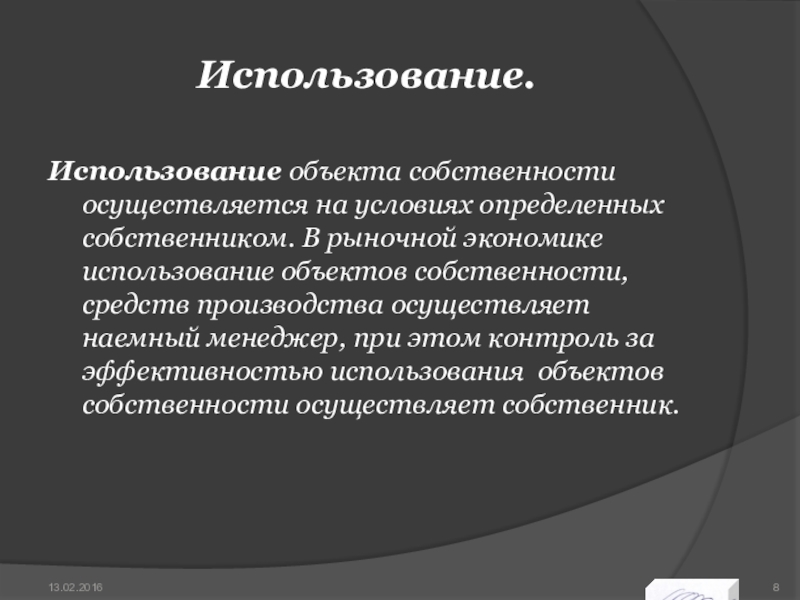 Использование объекта собственности осуществляется на условиях определенных собственником. В рыночной экономике