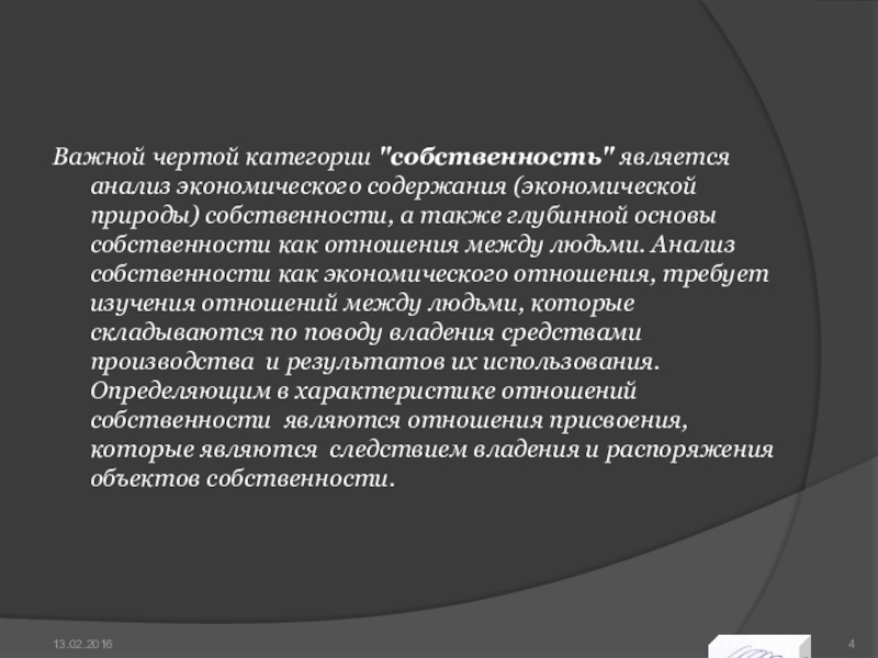 Слайд 4Важной чертой категории "собственность" является анализ экономического содержания (экономической природы) собственности,