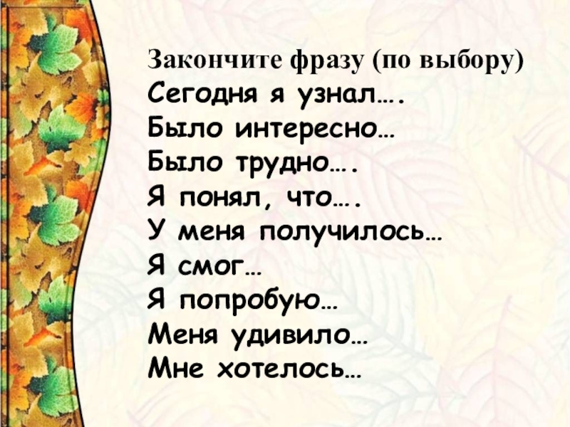 Закончите фразу (по выбору)Сегодня я узнал….Было интересно…Было трудно….Я понял, что….У меня получилось…Я смог…Я попробую…Меня удивило…Мне хотелось…