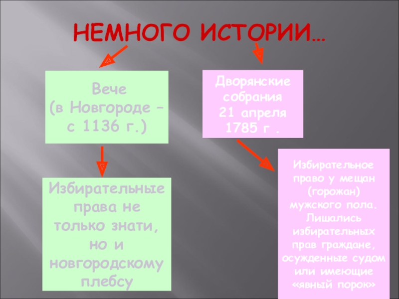 Избирательное право у мещан (горожан) мужского пола. Лишались избирательных прав граждане, осужденные судом или имеющие «явный порок»