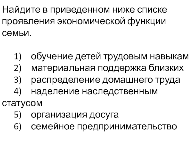 Слайд 15Найдите в приведенном ниже списке проявления экономической функции семьи.
