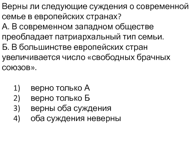 Слайд 23Верны ли следующие суждения о современной семье в европейских странах?