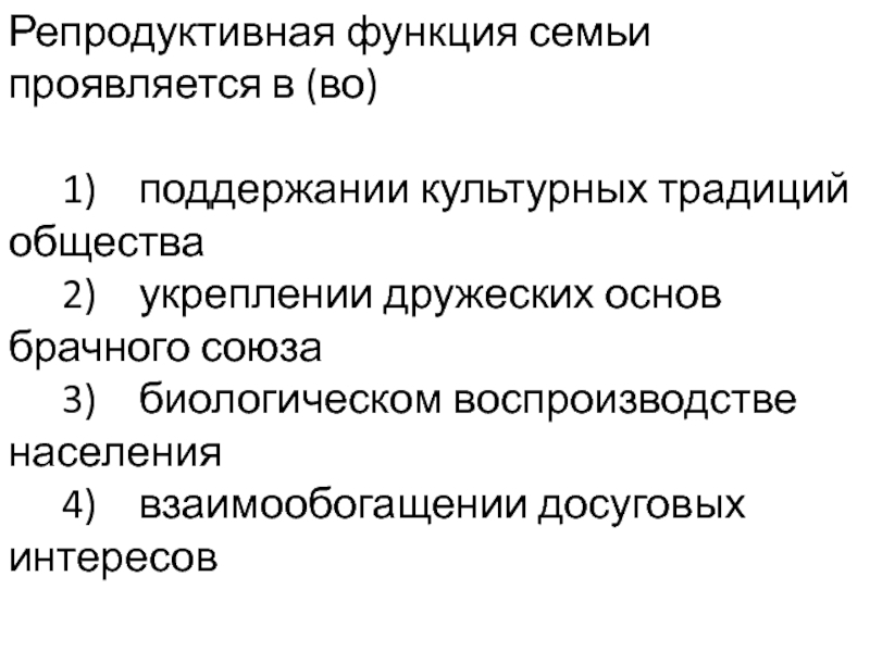 Слайд 16Репродуктивная функция семьи проявляется в (во)