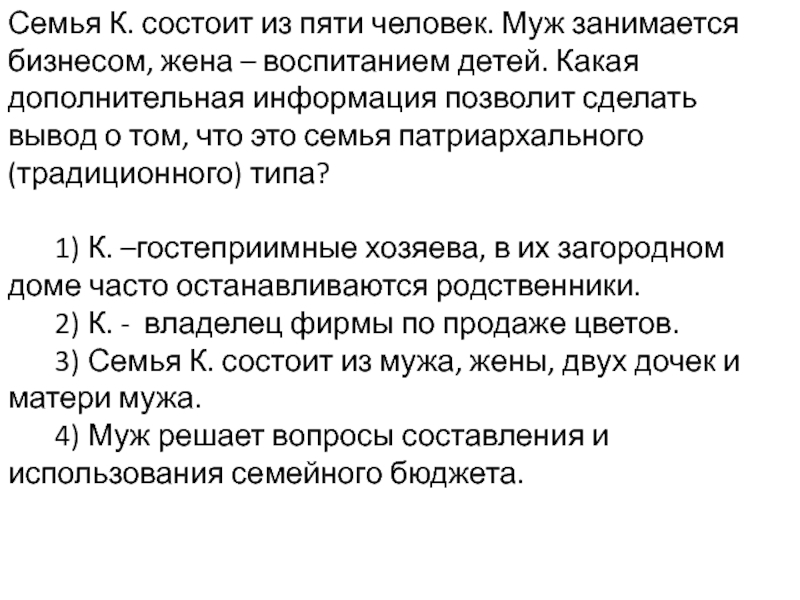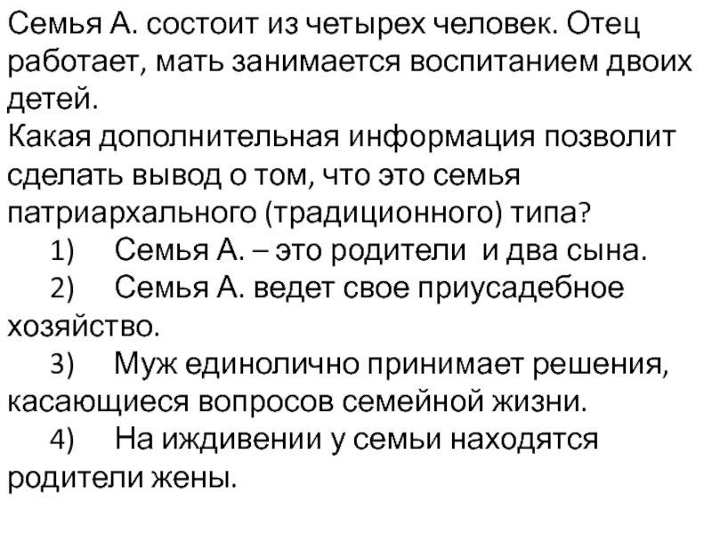 воспитанием детей. Какая дополнительная информация позволит сделать вывод о том, что это семья патриархального (традиционного) типа?