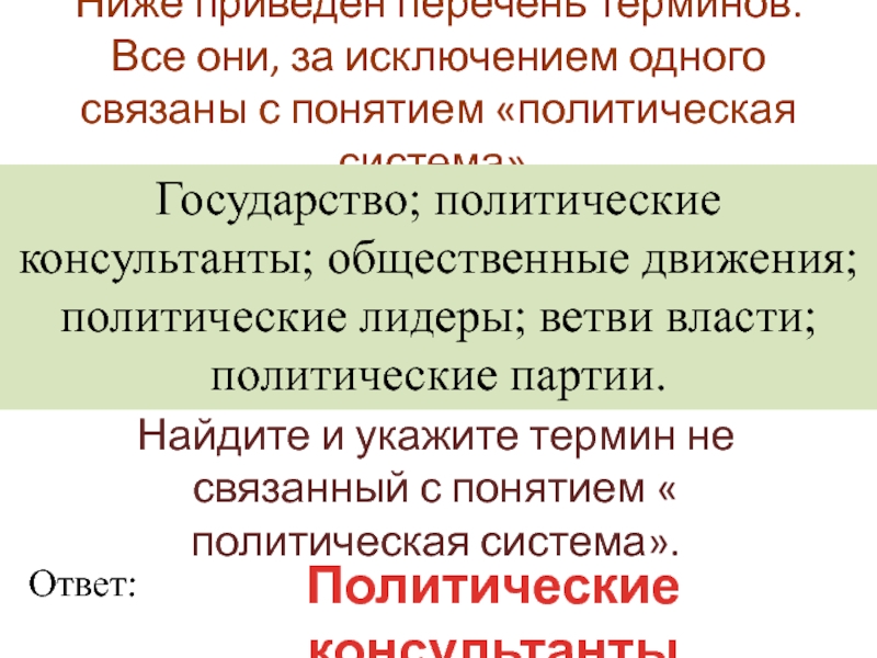 Найдите и укажите термин не связанный с понятием « политическая система».