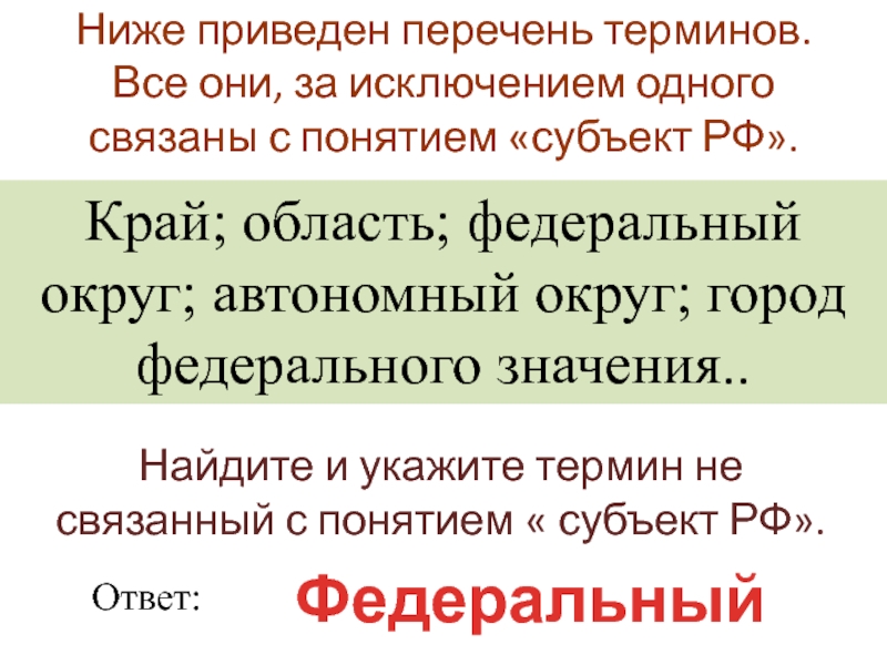 Найдите и укажите термин не связанный с понятием « субъект РФ».