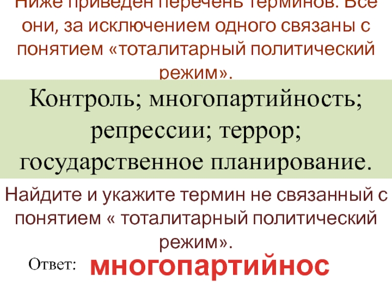 Найдите и укажите термин не связанный с понятием « тоталитарный политический режим».