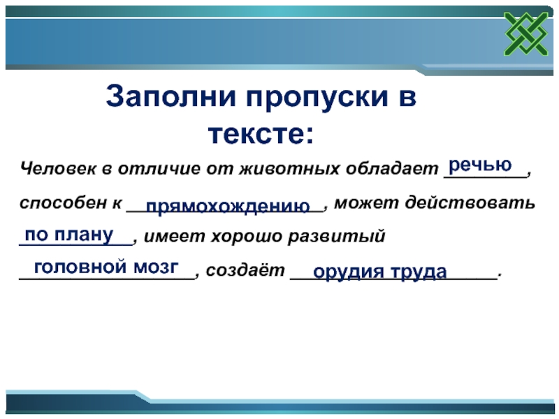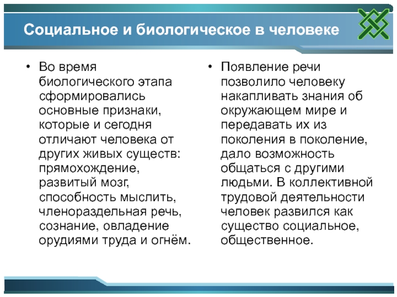 Появление речи позволило человеку накапливать знания об окружающем мире и передавать их из поколения в поколение, дало возможность общаться с другими людьми. В коллективной трудовой деятельности человек развился как существо социальное, общественное.