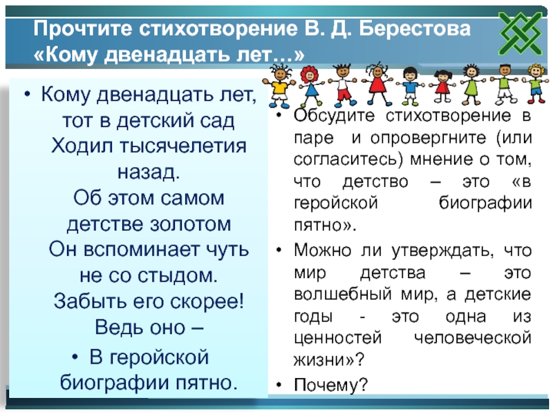 Обсудите стихотворение в паре и опровергните (или согласитесь) мнение о том, что детство – это «в геройской биографии пятно».