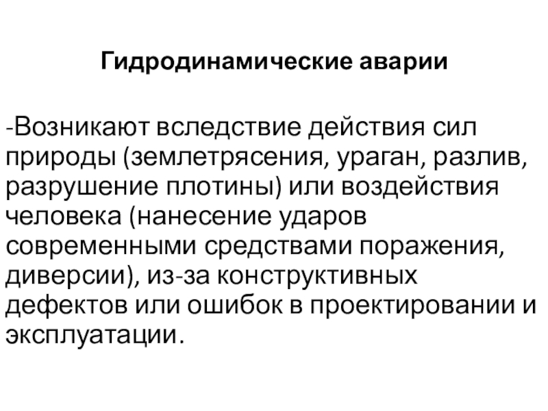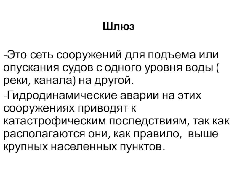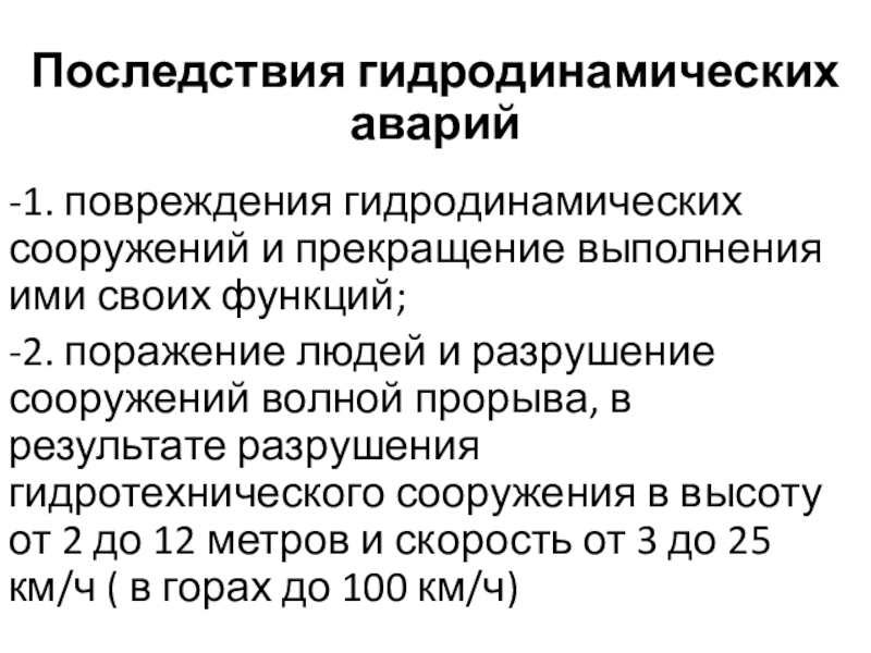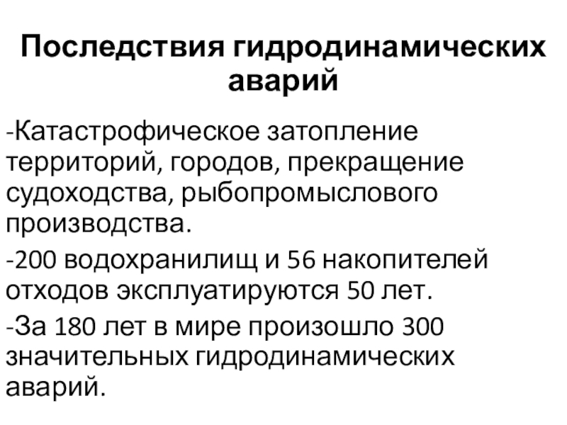 -Гидродинамические аварии на этих сооружениях приводят к катастрофическим последствиям, так как располагаются они, как правило, выше крупных населенных пунктов.